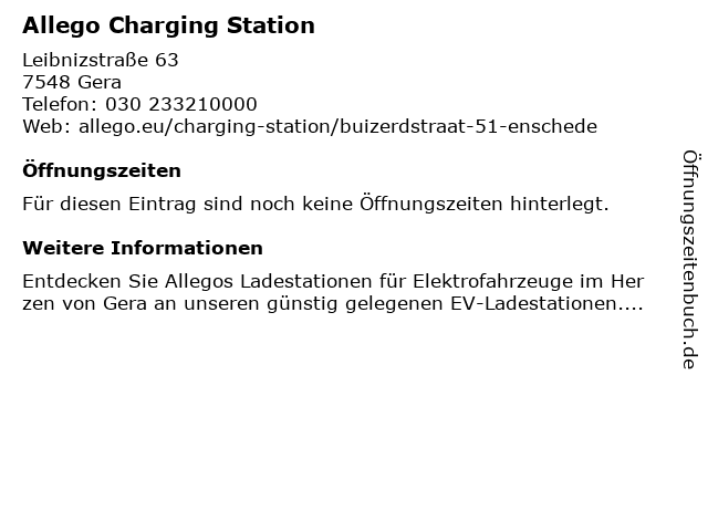 | Öffnungszeiten Allego Charging Station in Gera anzeigen | |