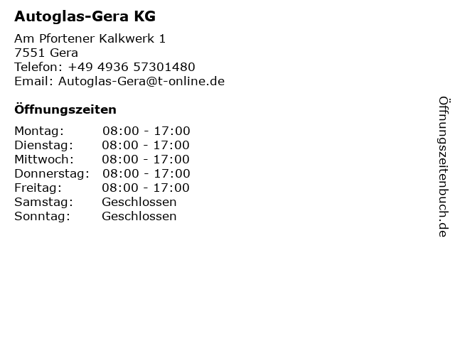 | Öffnungszeiten Autoglas-Gera KG in Gera anzeigen | |