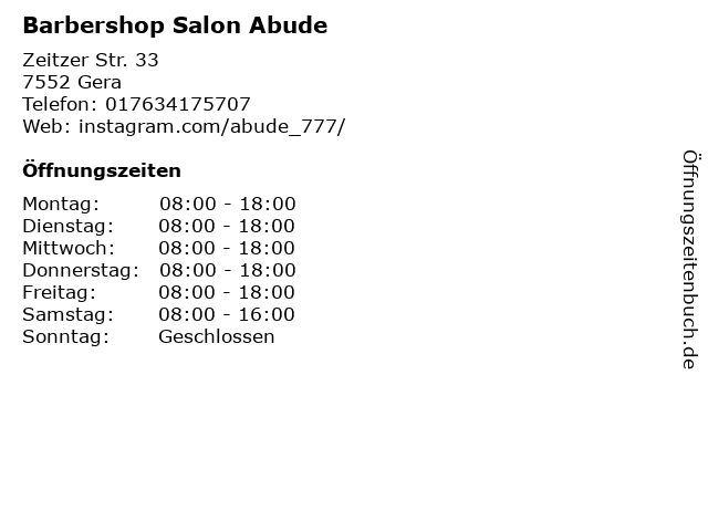 | Öffnungszeiten Barbershop Salon Abude in Gera anzeigen | |