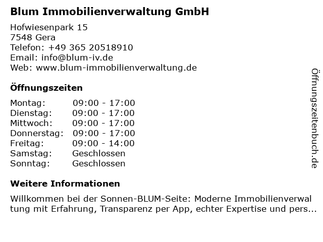 | Öffnungszeiten Blum Immobilienverwaltung GmbH in Gera anzeigen | |