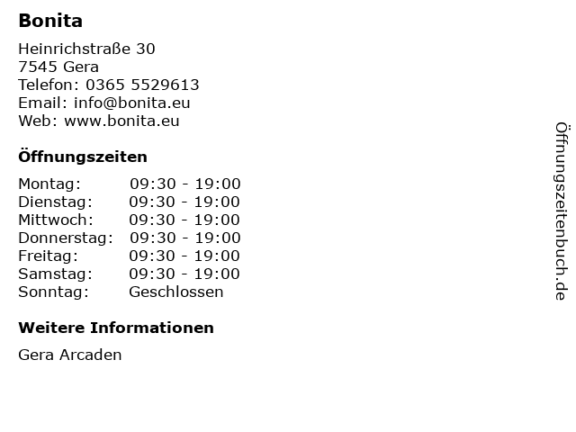 | Öffnungszeiten Bonita in Gera anzeigen | |