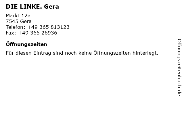 | Öffnungszeiten DIE LINKE. Gera in Gera anzeigen | |