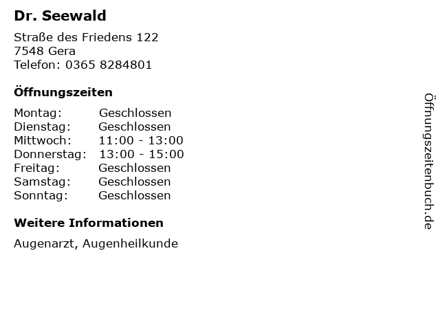 | Öffnungszeiten Dr. Seewald in Gera anzeigen | |