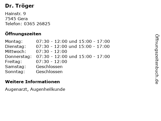| Öffnungszeiten Dr. Tröger in Gera anzeigen | |