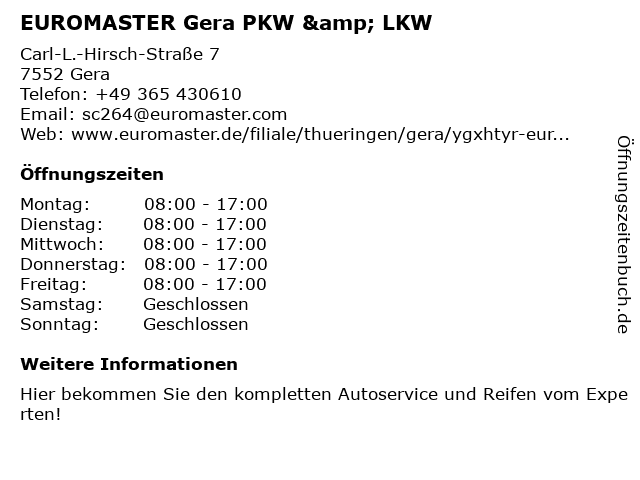 | Öffnungszeiten EUROMASTER Gera PKW & LKW in Gera anzeigen | |