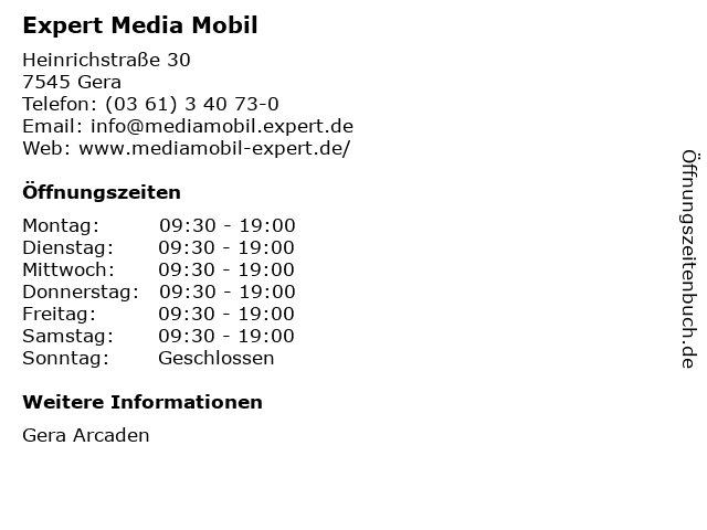 | Öffnungszeiten Expert Media Mobil in Gera anzeigen | |