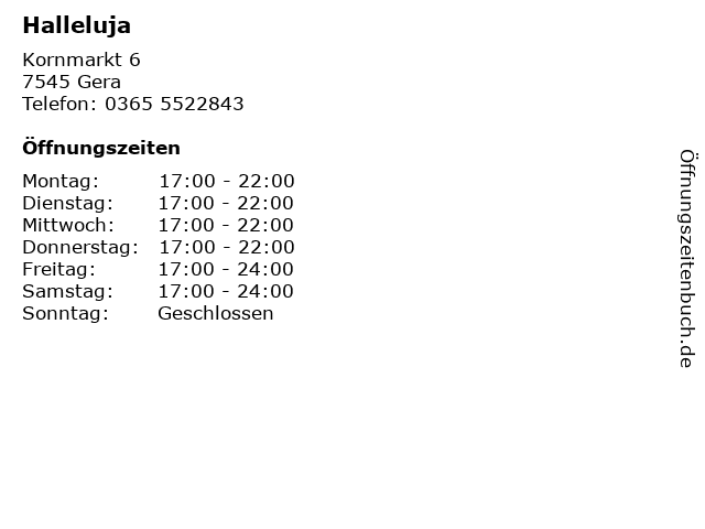 | Öffnungszeiten Halleluja in Gera anzeigen | |