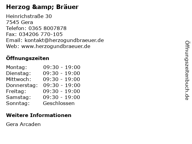 | Öffnungszeiten Herzog & Bräuer in Gera anzeigen | |