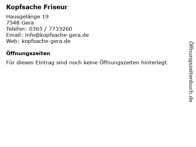 | Öffnungszeiten Kopfsache Friseur in Gera anzeigen | |