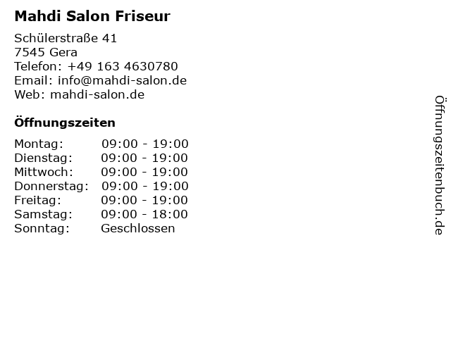 | Öffnungszeiten Mahdi Salon Friseur in Gera anzeigen | |