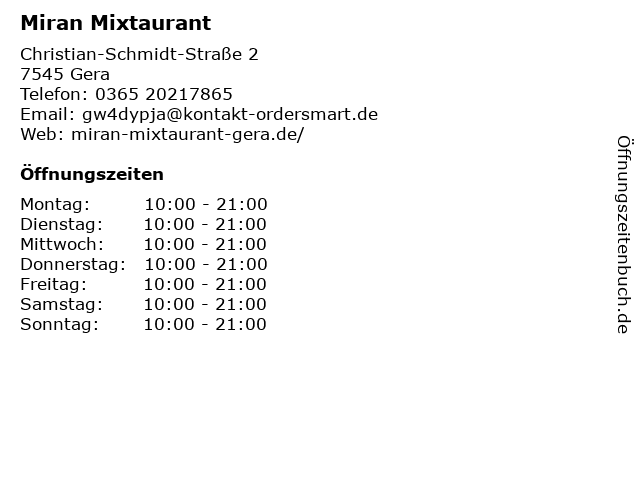 | Öffnungszeiten Miran Mixtaurant in Gera anzeigen | |
