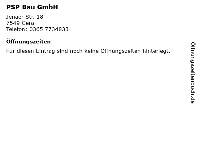 | Öffnungszeiten PSP Bau GmbH in Gera anzeigen | |