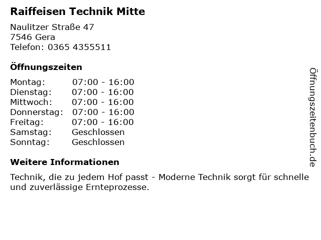 | Öffnungszeiten Raiffeisen Technik Mitte in Gera anzeigen | |