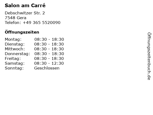 | Öffnungszeiten Salon am Carré in Gera anzeigen | |