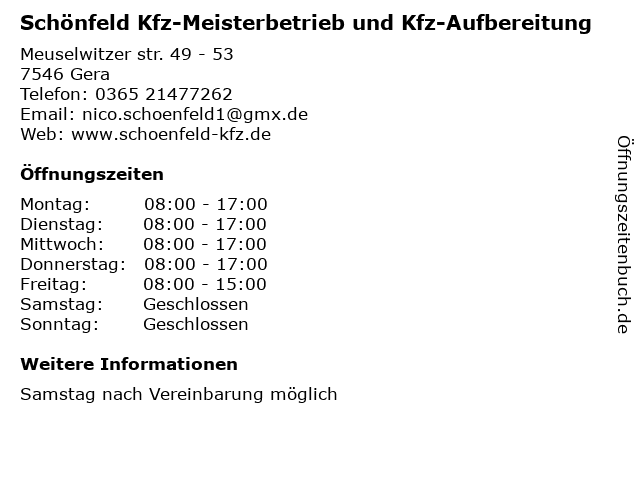 Branchen & Suchbegriffe zu Schönfeld Kfz-Meisterbetrieb und Kfz-Aufbereitung:achsvermessung, aufbereitung, fehlerdiagnose, inspektion, kfz, klimaservice, meisterbetrieb, reifenservice, reparatur, schönfeld, unfallreparatur, wartung, ölwechsel |