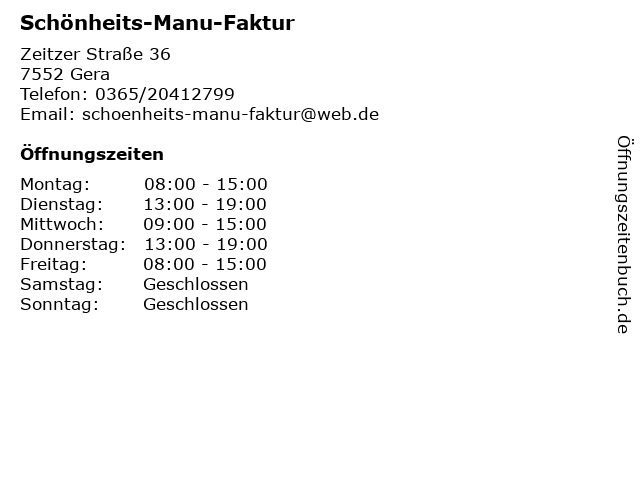 | Öffnungszeiten Schönheits-Manu-Faktur in Gera anzeigen | |