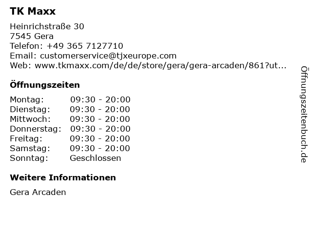| Öffnungszeiten TK Maxx in Gera anzeigen | |