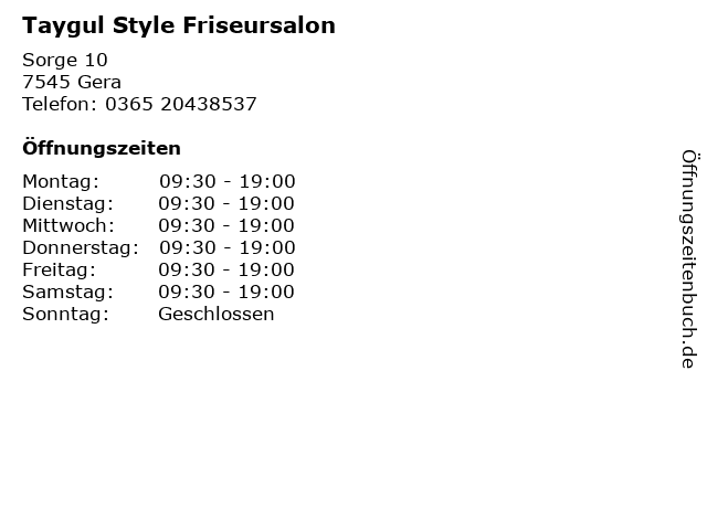 | Öffnungszeiten Taygul Style Friseursalon in Gera anzeigen | |