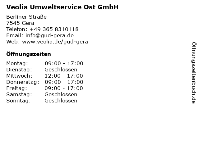 | Öffnungszeiten Veolia Umweltservice Ost GmbH in Gera anzeigen | |
