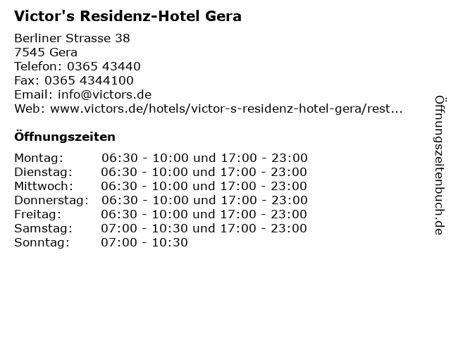 | Öffnungszeiten Victor's Residenz-Hotel Gera in Gera anzeigen | |
