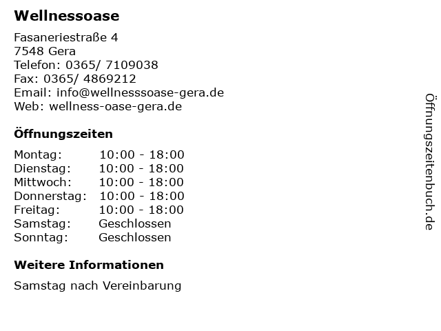 | Öffnungszeiten Wellnessoase in Gera anzeigen | |