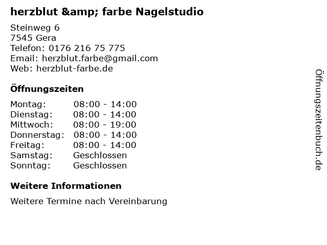 Öffnungszeiten herzblut & farbe Nagelstudio in Gera anzeigen | |