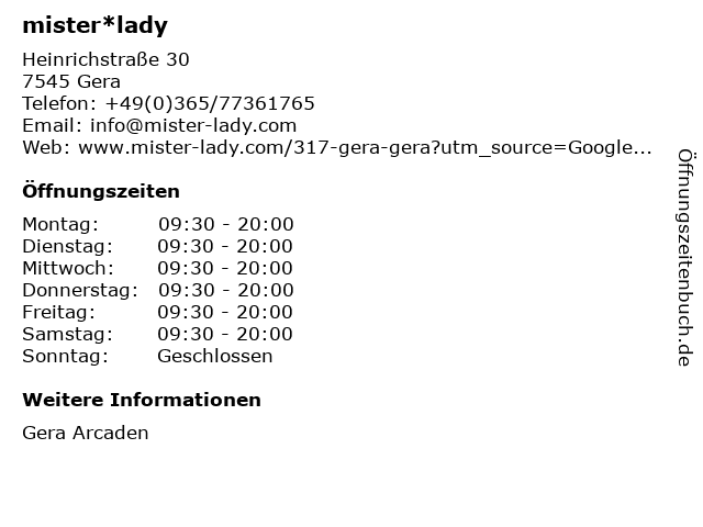 | Öffnungszeiten mister*lady in Gera anzeigen | |