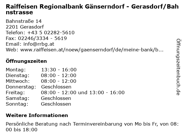 1 Raiffeisen-Regionalbank Gänserndorf - (Bankomat Bankstelle) (Entfernung: 0,00 km) Bahnstraße 14, 2201 Gerasdorf 2 6 |