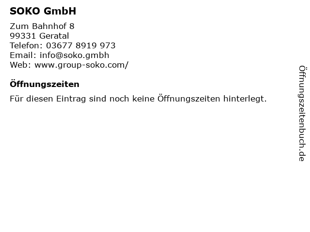 | Öffnungszeiten SOKO GmbH in Geratal anzeigen | |