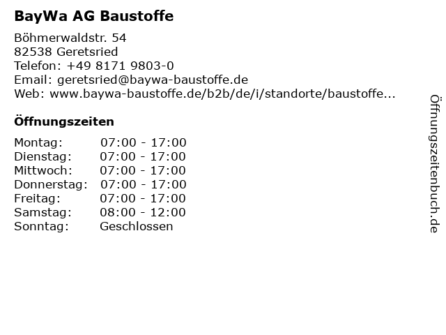 | Öffnungszeiten BayWa AG Baustoffe in Geretsried anzeigen | |