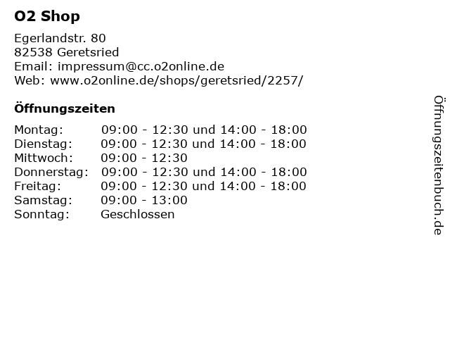 | Öffnungszeiten O2 Shop in Geretsried anzeigen | |