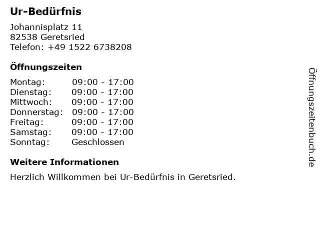 | Öffnungszeiten Ur-Bedürfnis in Geretsried anzeigen | |
