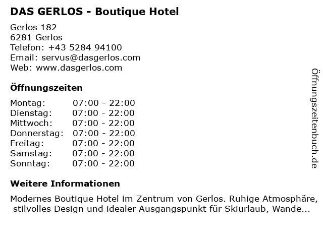 | Öffnungszeiten DAS GERLOS - Boutique Hotel in Gerlos anzeigen | |