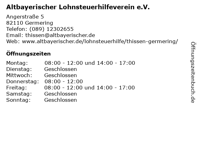 1 Altbayerischer Lohnsteuerhilfeverein e.V. (Entfernung: 5,47 km) Pentenrieder Str. 27a, 82152 Krailling 3 Altbayerischer Lohnsteuerhilfeverein e.V. (Entfernung: 8,70 km) Mathias-Duschl-Str. 7g, 82140 Olching 5 Altbayerischer Lohnsteuerhilfeverein e.V. (Entfernung: 10,04 km) Hönlestr. 16 80689 Tel: 16, 80689 München 6 |