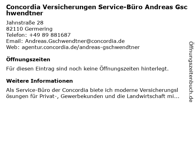 | Concordia Versicherungen Service-Büro Andreas Gschwendtner anrufen | |