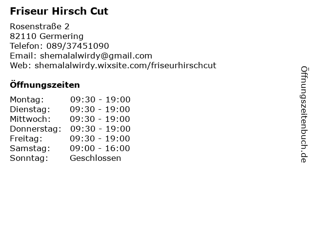 | Öffnungszeiten Friseur Hirsch Cut in Germering anzeigen | |