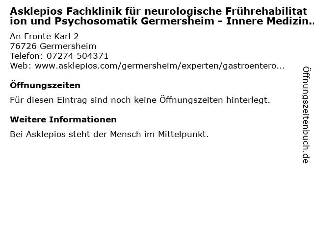 Asklepios Fachklinik für neurologische Frührehabilitation und Psychosomatik Germersheim - Innere Medizin - Closed anrufen | |