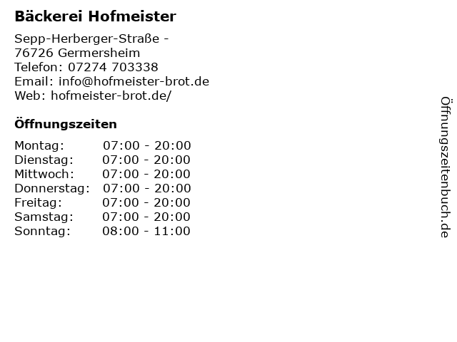 | Öffnungszeiten Bäckerei Hofmeister in Germersheim anzeigen | |