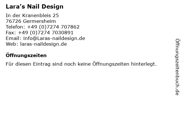 | Öffnungszeiten Lara’s Nail Design in Germersheim anzeigen | |