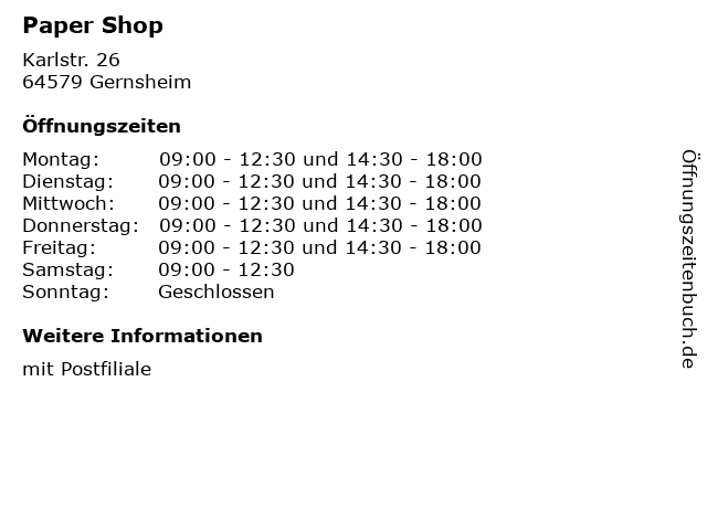 | Öffnungszeiten Paper Shop in Gernsheim anzeigen | |