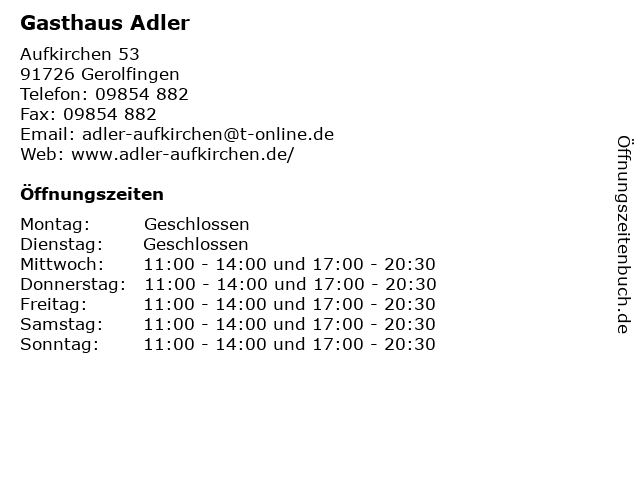 | Öffnungszeiten Gasthaus Adler in Gerolfingen anzeigen | |