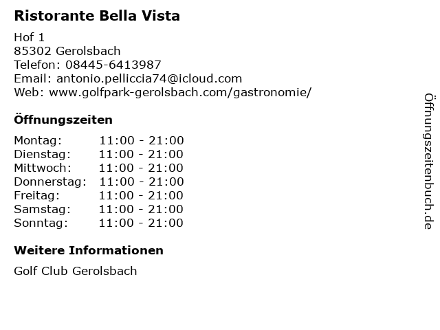 | Öffnungszeiten Ristorante Bella Vista in Gerolsbach anzeigen | |