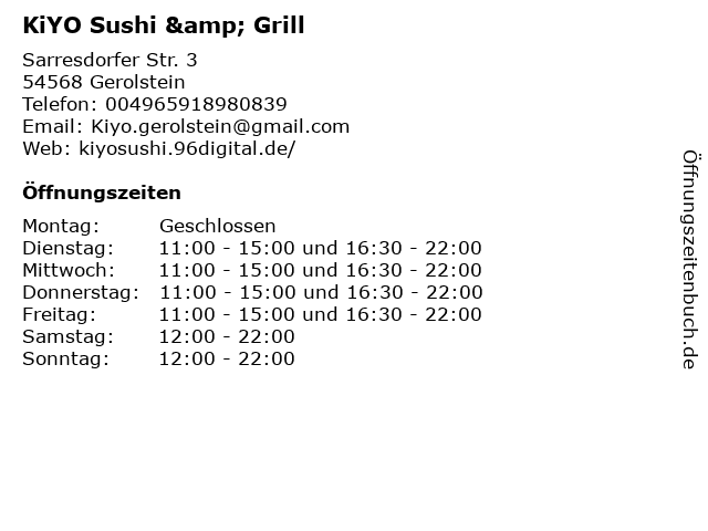 | Öffnungszeiten KiYO Sushi & Grill in Gerolstein anzeigen | |