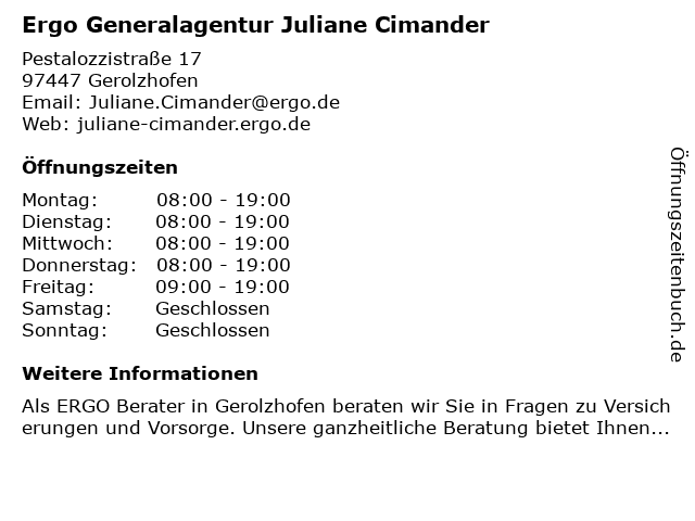 Öffnungszeiten Ergo Generalagentur Juliane Cimander in Gerolzhofen anzeigen | |