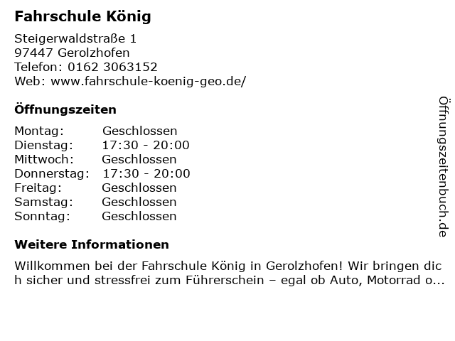 | Öffnungszeiten Fahrschule König in Gerolzhofen anzeigen | |
