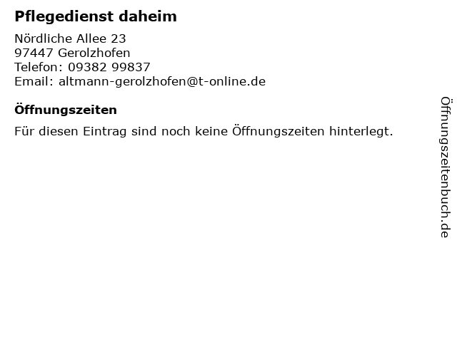 | Öffnungszeiten Pflegedienst daheim in Gerolzhofen anzeigen | |