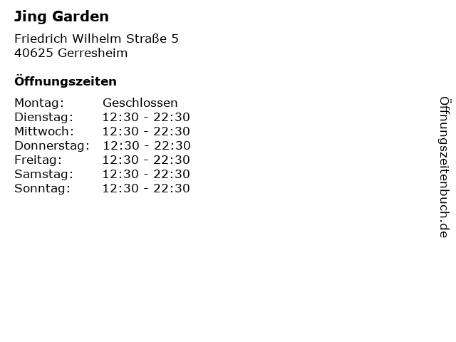 | Öffnungszeiten Jing Garden in Gerresheim anzeigen | |
