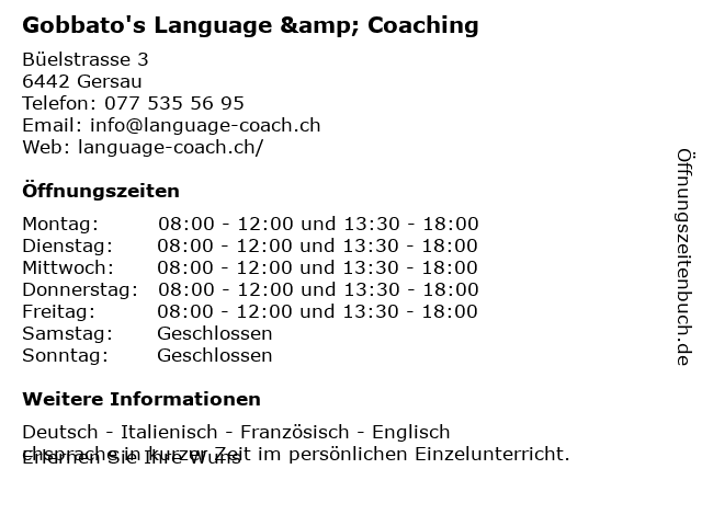 | Öffnungszeiten Gobbato's Language & Coaching in Gersau anzeigen | |