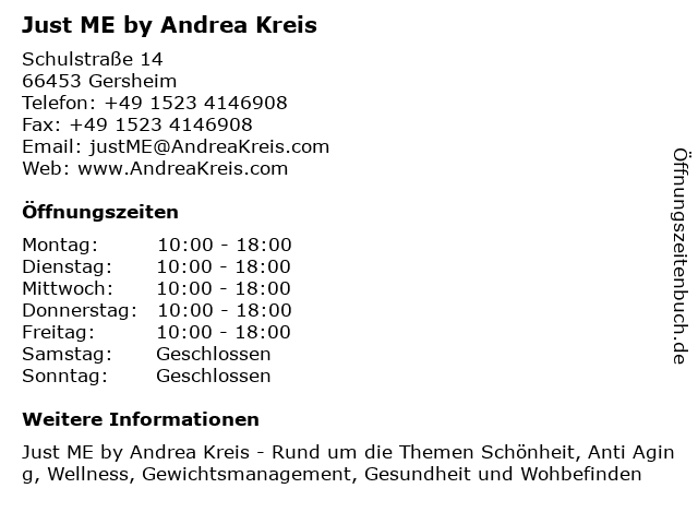 | Öffnungszeiten Just ME by Andrea Kreis in Gersheim anzeigen | |