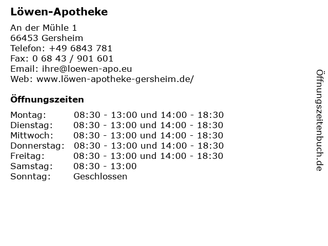 | Öffnungszeiten Löwen-Apotheke in Gersheim anzeigen | |
